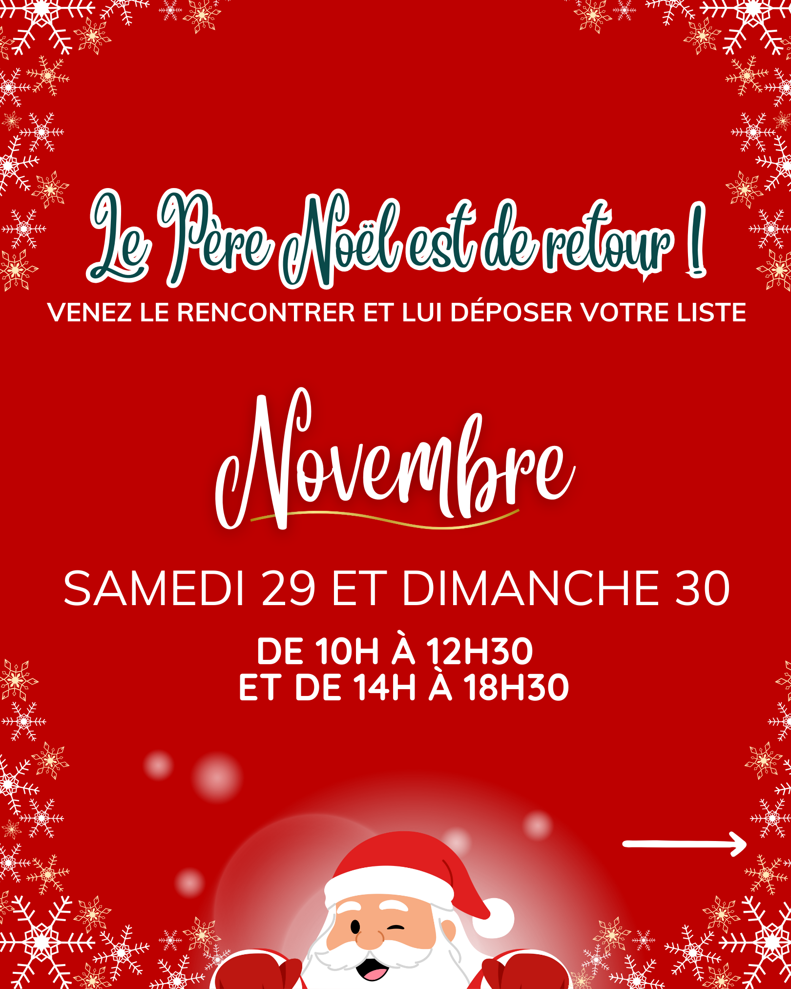 Le compte à rebours est lancé ! Dès le samedi 29 novembre, les allées de votre galerie vont vibrer au rythme des clochettes et de la joie des fêtes. Nous sommes ravis d’annoncer que l’hôte le plus attendu de l’année, le Père Noël, s’installe officiellement chez nous pour tout le mois !